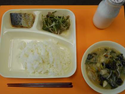 本日の給食メニューは、さごしの醤油だれかけ・みそ汁・みずなの煮びたし・ご飯・牛乳です。みそ汁は、赤みそと白みそをブレンドした味つけで、わかめ・にんじん・たまねぎ・豆腐・もやし・しめじ・白ねぎが入っていました。おいしくいただきました。(校長室より 1月19日)