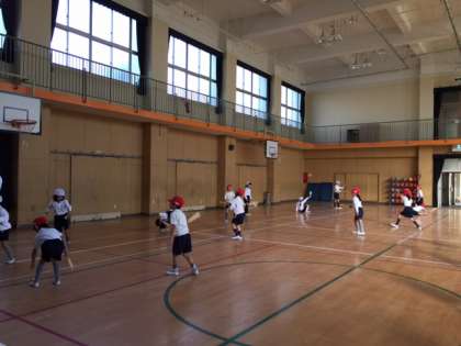 講堂で、羽根つきをしました。初めは、なかなか打つことができませんでしたが、練習しているうちに、羽子板にうまく羽根が当たるようになり、何回か続けることができていたペアもありました。