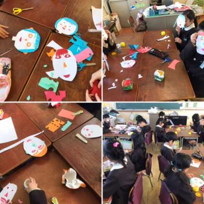 2年生は図工で紙版画を作っています。「○○しているところ」を考えました。ダンスをしているところ、跳び箱を跳んでいるところ、サッカーをしているところなどを想像しました。手や足の動きも工夫して表現していました。どんな作品が出来上がるか楽しみです。