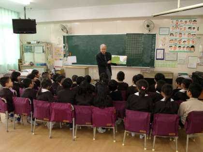 ボランティアの方は3名のため、1−3は出水先生に読み聞かせをしてもらいました。