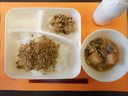 本日の給食メニューは、焼きとり・豚肉とあつあげの煮物・紅ざけそぼろ・牛乳です。豚肉とあつあげの煮物は、醤油ベースの味付けで豚肉とあつあげの他、にんじん、たまねぎ、こんにゃく、むき枝豆が入っておりバランスの良い1品でした。(校長室より 4月14日)