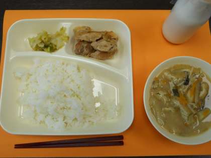 本日の給食メニューは、鶏肉の甘辛焼き・みそ汁・キャベツの梅風味・牛乳・ご飯です。みそ汁は、赤みそと白みそを合わせた味でうすあげ、にんじん、じゃがいも、ごぼう、えのきたけが入っており、ごぼうの香が感じられおいしくいただきました。(校長室より 4月17日)