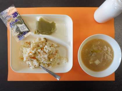 「かやくご飯・味噌汁・抹茶ういろう・きざみのり・牛乳」です。