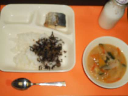 本日の給食メニューは、さごしの塩焼き・みそ汁・牛ひじきそぼろ・ご飯・牛乳です。みそ汁は、にんじん、たまねぎ、キャベツ、うすあげ、かぼちゃ、だいこん葉が入りバランスのとれた栄養たっぷりの汁ものでした。(校長室より 6月1日)