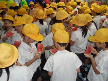 セレモニー後、とっても甘くでみずみずしいすいかをいただきました。等級も最高ランクの大きな玉のすいかを切っていただきました。3年生 大満足!!(校長室より 6月8日)