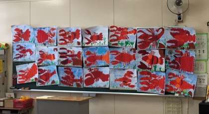 2年生の教室で、ザリガニの大群ががいきいきと歩いていました! なかなかリアルです! (6.15 教務)