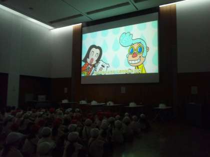 現地に到着して、まずは水がきれいになる仕組みについてのDVDを鑑賞しています。