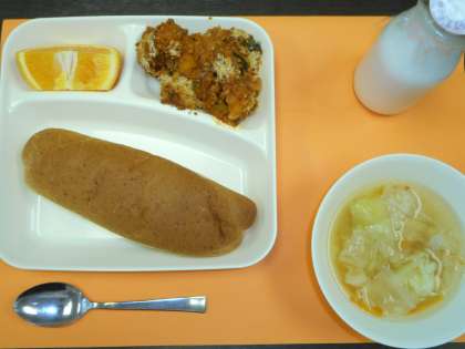 本日の給食メニューは、かぼちゃのミートグラタン・スープ・オレンジ・ライ麦パン・牛乳です。かぼちゃのミートグラタンは、かぼちゃを適度な大きさにすることで、かぼちゃのゴロゴロ感と味がミートグラタンと合わさりおいしくいただきました。(校長室より 7月4日)