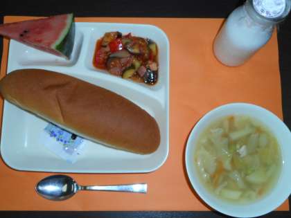 本日の給食メニューは、押し麦のスープ・夏野菜とベーコンのソテー・すいか・大型コッペパン・牛乳・ブルベリージャムです。夏野菜とベーコンのソテーは、からいりしたベーコンと夏野菜(なす、たまねぎ、きゅうり、赤ピーマン、トマト)をいためた後、砂糖、塩、こしょう、ワインビネガーで味付けしています。とてもおいしくいただきました。(校長室より 7月12日)