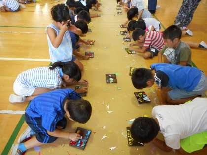 朝食後、焼板づくりをしました。用意された焼板に、自由にペイントしています。キャンプの思い出をペイントした子どもたちもいました。ご家庭でゆっくり見てください。