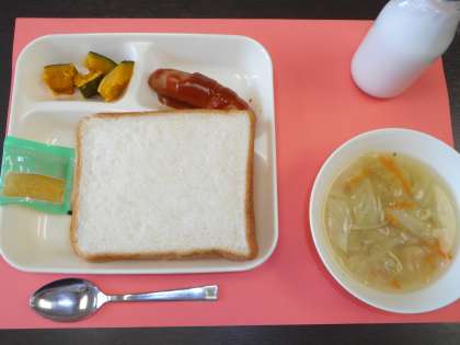本日の給食メニューは、フランクフルトのケチャップソース・スープ・焼きかぼちゃ・食パン・牛乳・りんごジャムです。スープは、チキンスープをベースに鶏肉、にんじん、たまねぎ、キャベツ、パセリが入っており、野菜本来の甘みも感じられおいしくいただきました。            (校長室より 9月1日)