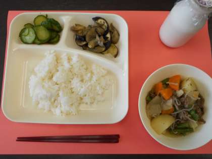 本日の給食メニューは、肉じゃが・焼きなすのみそだれかけ・あっさりきゅうり・ご飯・牛乳です。焼きなすのみそだれかけは、赤みそベースの甘辛い味がなすにからまっており、ご飯によく合う1品でした。 (校長室より 9月6日)