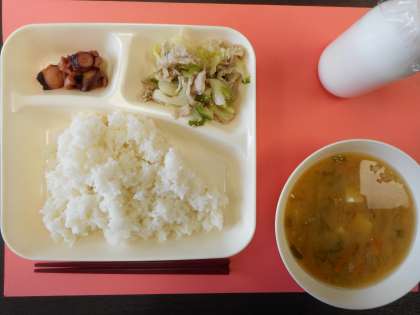 本日の給食メニューは、たこのやわらか煮・みそ汁・野菜炒め・ご飯・牛乳です。みそ汁は、赤みそ・白みその合わせたものとだしこんぶ・けずりぶしのだしを合わせたものに、にんじん・たまねぎ・かぼちゃ・とうふが入っておりボリュームのあるみそ汁でした。 (校長室より 9月11日)