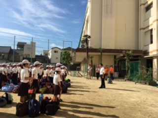 昨日の大雨はどこへやら、青空のもと、自然体験学習の出発式がありました。これから2泊3日でカッター体験やカレー作りなど、さまざまな体験をします。子どもたちは緊張と楽しみと、いろんな表情です。