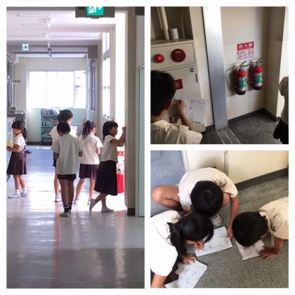 防火バケツ・火災報知器などの設備が、どこに設置されているのかを調べ、グループで確認していました。一生懸命、取り組んでいました。