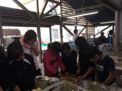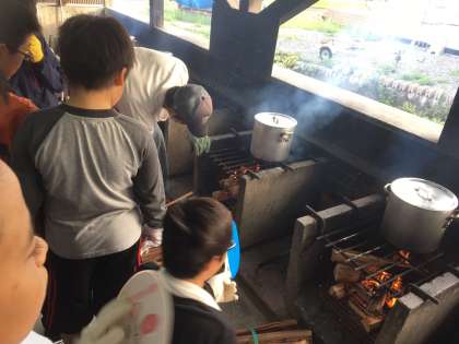 野外炊飯が始まりました!火の番をする子、野菜を切る子、みんなで仕事を分担して楽しく活動しています。カレーライス、おいしくできるかな??
