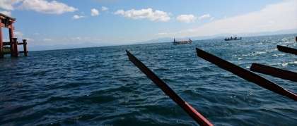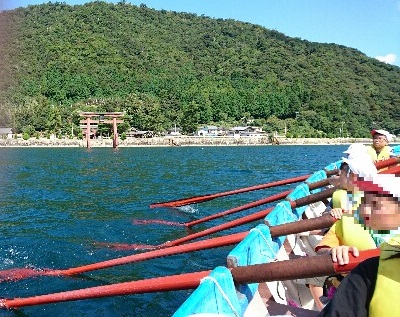 子どもたちは白髭神社の鳥居を目指してカッターを漕ぎます。