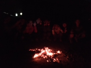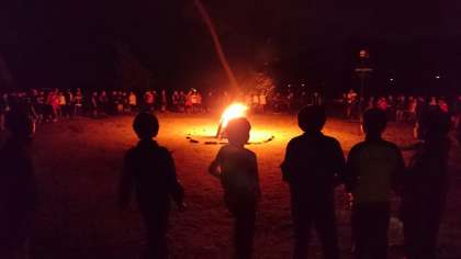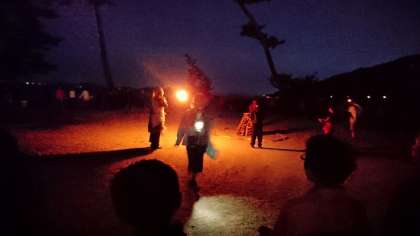 火の神様が火の精を伴って登場。点火をし、スタートしました。そのあと、指導員のパパラさんとベリーさんの指導の下、火を囲んで楽しいゲームをして遊びました。
