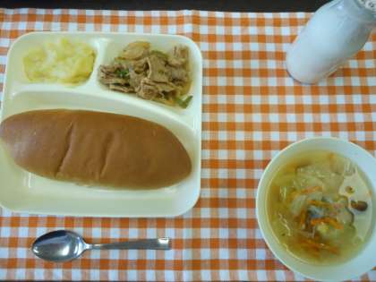 本日の給食メニューは、豚肉と野菜のケチャップソテー・スープ・スイートポテト・黒糖パン・牛乳です。スイートポテトは、柔らかく煮られたさつまいもに砂糖、バター、牛乳、クリームを加え焼き物機で焼いています。さつまいもの食感を残しつつ程よい甘みでおいしくいただきました。(校長室より 10月2日)