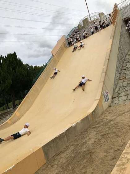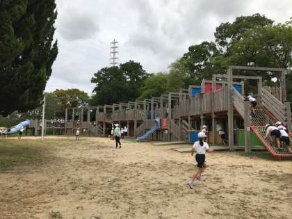 大泉緑地に着いた子どもたちは林を抜け、さっそく大きな滑り台やアスレチックで遊んでいます。思い切り体を動かして、楽しんでほしいですね。