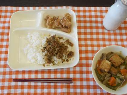 本日の給食メニューは、鶏肉のたつたあげ・あつあげと野菜の煮物・おかか菜っ葉・ご飯・牛乳です。おかか菜っ葉の葉は、だいこん葉が使われています。だいこん葉は、緑黄色野菜の1つで、鉄やカルシウム、ビタミンCやカロテンなどの栄養素を多く含んでいます。かつおぶし、だいこんの葉、いりごまが濃口醤油ベースの味で合わさっており、ご飯によく合う1品でした。(校長室より 10月10日)
