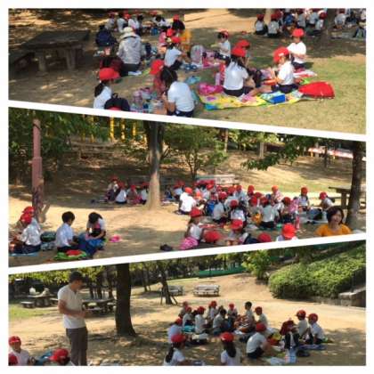 緑いっぱいの中で、食欲満開!みんなで仲良く食べています。