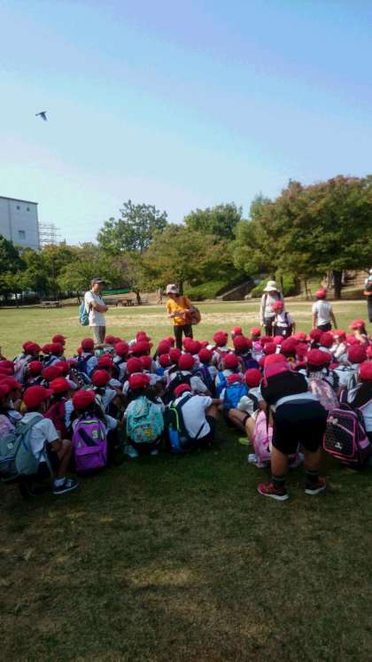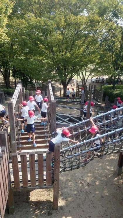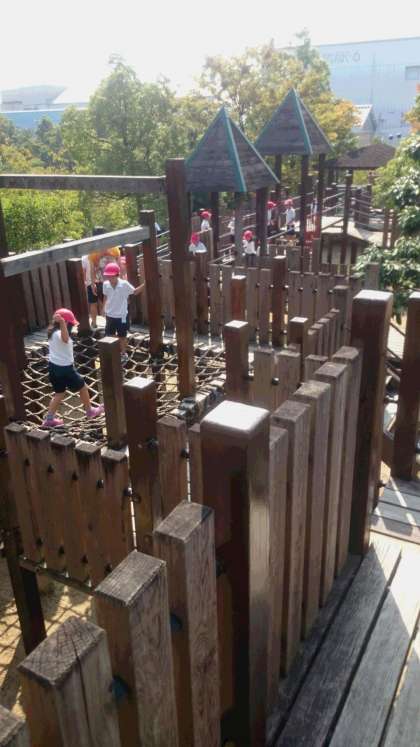 秋晴れに恵まれた今日の遠足。子ども達は元浜緑地公園のアスレチック遊具を楽しんでいました。