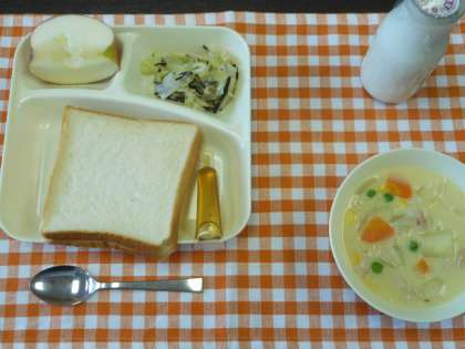 本日の給食メニューは、コーンクリームシチュー(米粉使用)キャベツのひじきドレッシング・りんご・食パン・牛乳・はちみつです。今日のコーンクリームシチューは、小麦粉ではなく米粉を使用しています。鶏肉、にんじん、たまねぎ、じゃがいも、スイートコーン、グリンピースが入っておりおいしくいただきました。(校長室より 10月12日)