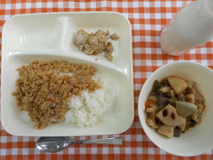 本日の給食メニューは、豚肉のねぎだれかけ・ふきよせ煮・ツナ大豆そぼろ・ご飯・牛乳です。「ふきよせ」は、秋から冬のはじめにかけて献立に使われる名前です。「風にふきよせられた落ち葉を思わせるように秋の味覚を盛り合わせた料理」のことで、季節の旬の食材が使われています。今日のふきよせ煮は、にんじん、れんこん、たまねぎ、こんにゃく、さといも、しめじが使われています。おいしくいただきました。 (校長室より 10月13日)
