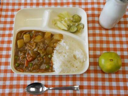 本日の給食メニューは、ポークカレーライス(米粉使用)・グリーンサラダ・みかん・牛乳です。ポークカレライスは、豚肉、たまねぎ、にんじん、じゃがいも、グリーンピースが入っており、こくのあるカレールウでおいしくいただきました。(校長室より 10月18日)