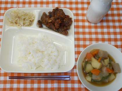 本日の給食メニューは、くじらのオーロラ煮・じゃがいもとこんにゃくの煮もの・もやしのゆずの香あえ・ご飯・牛乳です。くじらのオーロラ煮は、くじらを料理酒、しょうが汁で下味をつけ油で揚げた後、ケチャップ、砂糖、赤みそと合わせて煮ています。ご飯によく合う1品でした。(校長室より 11月8日)