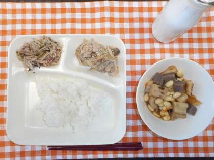 豚肉のごまだれ焼きは、豚肉としめじ、たまねぎに下味(ねりごま・砂糖・みりん・濃口しょうゆ)をつけて焼き物機で焼きます。豚肉の油が程よく残り、ごまの旨みが感じられる献立でした。大豆の煮ものは、レンコンやニンジンなどの根菜とこんにゃく、昆布などが入ったヘルシーな煮物でした。大豆の甘みがちょうどよくとてもおいしく仕上がっていました。切り干し大根のしそ甘酢づけは、赤紫蘇の味と香りが爽やかで、煮物とは一味違うおいしさが感じられました。これから気温がどんどん低くなっていきます。今日の献立にあるような根菜をたっぷり食べると身体が温まるようです。健康に良いものを多く摂りたいですね。今日もおいしくいただきました。ごちそうさま!