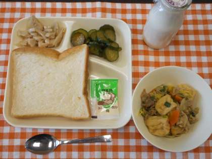 本日の給食メニューは、中華煮・れんこんのオイスターソース焼き・きゅうりの辛みづけ・食パン・マーガリン・牛乳です。きゅうりの辛みづけは、きゅうりと砂糖、濃い口しょうゆを合わせて煮た後、ラー油を加えています。よく味がきゅうりにしみ込んでいておいしくいただきました。(校長室より 12月1日)