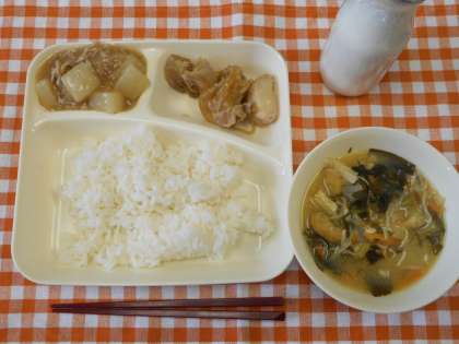 本日の給食メニューは、鶏肉の甘辛焼き・みそ汁・大根の煮物・ご飯・牛乳です。大根の煮物は、みりん、淡口しょうゆをベースに味付けされ大根と豚肉の組み合わせもよくおいしくいただきました。 (校長室より 12月5日)