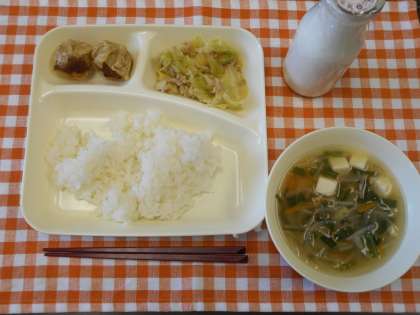 本日の給食メニューは、あげシューマイ・えびと豆腐のスープ・ツナとキャベツのいためもの・ご飯・牛乳です。えびと豆腐のスープは、えび、にんじん、たまねぎ、豆腐、もやし、にらの入った中華スープです。えびアレルギーの児童には、えびを除去して提供しています。シューマイは、中国料理の点心の1つで子どもでも1口で食べられるような大きさでした。(校長室より 12月6日)
