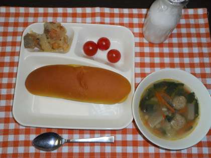 本日の給食メニューは、さけのマリネ、肉団子と麦のスープ、プチトマト、パンプキンパン・牛乳です。さけのマリネは、油で揚げたさけに薄く切ったたまねぎとりんご酢、オリーブ油、白ワインで作ったマリネソースをからませたものです。程よい酸味とオリーブ油の香りでおいしくいただきました。(校長室より 12月14日)