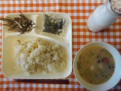 本日の給食メニューは、蓮根のちらしずし・雑煮・ごまめ・きざみのり・牛乳です。雑煮は、金時にんじん、大根、里芋、鶏肉、みつば、白玉もちが入っており、白みそ・赤みそをブレンドし味付けされています。おいしくいただきました。(校長室より 1月12日)