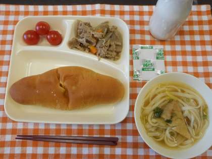 本日の給食メニューは、豚肉とごぼうの煮物・なにわうどん・プチトマト・レーズンパン・牛乳です。「なにわうどん」は、甘辛く煮たうすあげと、かまぼこ、青ネギが入ったきつねうどんをイメージしたうどんに、「とろろこんぶ」をのせて食べます。寒い今日は、とっても温まる1品でした。(校長室より 2月5日)