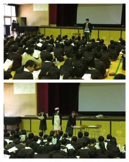 6時間目、下福島中学校の生徒会メンバーが、中学校の生活を紹介しに来てくれました。劇や軽快なトークで笑いを誘いながら、詳しく教えてくれました。