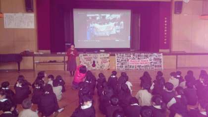 フェリシモの会社の方がインドのコットンプロジェクトについてのお話をしてくださいました。インド綿を使った衣服の紹介やインドの学校の子どもの様子をおしえてくれました。(H30・2・22 2年生)