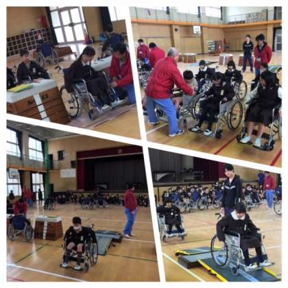 今日は、大阪市立リハビリセンターの方々が来られて、4年生の子どもたちに車いすの操作方法について教えてくださいました。まず初めに車いすの各部の名前を学習し、次に実際に操作をしました。普段、歩いたり自転車に乗ったりしているときには気にならないような、ちょっとした段差や緩やかな坂道が、車いすになると越えることが難しいことに気づきました。今回の経験から、身の回りのバリアフリーに目を向けるとともに、すべての人に対してやさしく接することができるようになればいいなと思います。