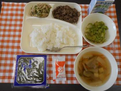 本日の給食メニューは、手巻きご飯(牛肉の甘辛煮・ツナソテー)・すまし汁・和なしの抹茶クランブル・牛乳・焼きのり・ノンエッグドレッシングです。卒業祝い献立で、6年生の卒業をお祝いするためです。クランブルは、イギリスの代表的なお菓子です。手巻きご飯は、具材を自分の適量を入れて食べられるので子どもたちにも喜ばれるメニューです。 (校長室より 3月7日)