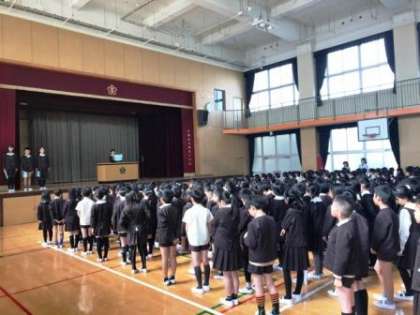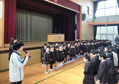 1つ学年が上がり、気持ちも新たに登校してきた2〜6年生。「どんなクラスかな?」「担任の先生は?」と、わくわくドキドキした気持ちで講堂に入ってきました。