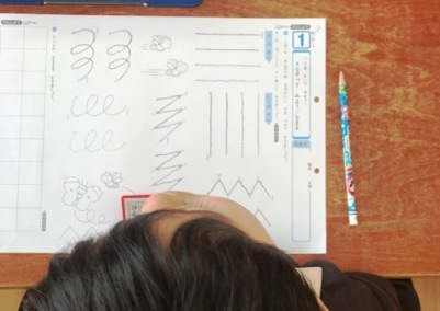 写真は、国語の学習の様子です。今日は、正しい字を書くための第1歩。正しい姿勢と正しい鉛筆の持ち方を教わり、なぞり書きをしています。