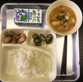 焼きとり、みそ汁、きょうりともやしのゆずあえ