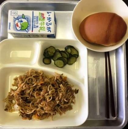 4月16日(月)の献立は やきそば きゅうりのしょうがづけ パンは黒糖パンでした。