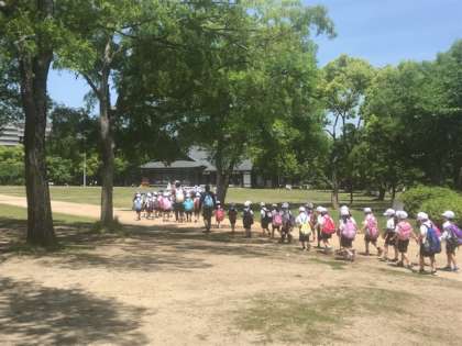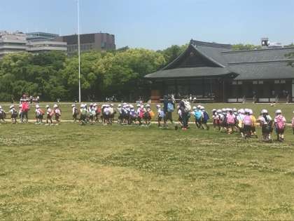 広い西の丸庭園に着きました。多くの学校の子どもたちでにぎわっています。