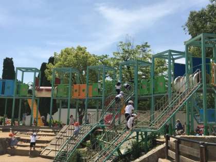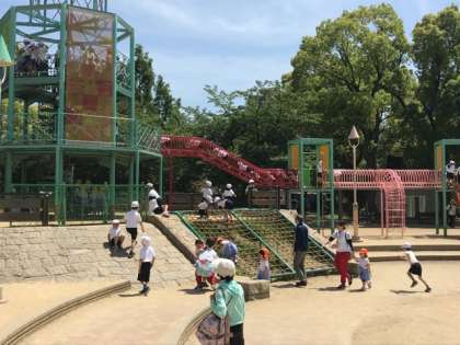 公園の東南角、森ノ宮駅近くまで移動し、大きな遊具で遊んでいます。