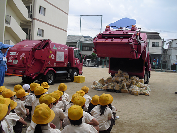 パッカー車がゴミを出すところを見せていただいたり、実際にゴミを回収する体験をさせていただいたりしました。
