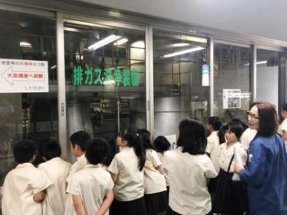 炉を管理している中央制御室の様子(写真左)や、煙をきれいにする排ガス洗浄装置を廊下越しに見せていただきました。